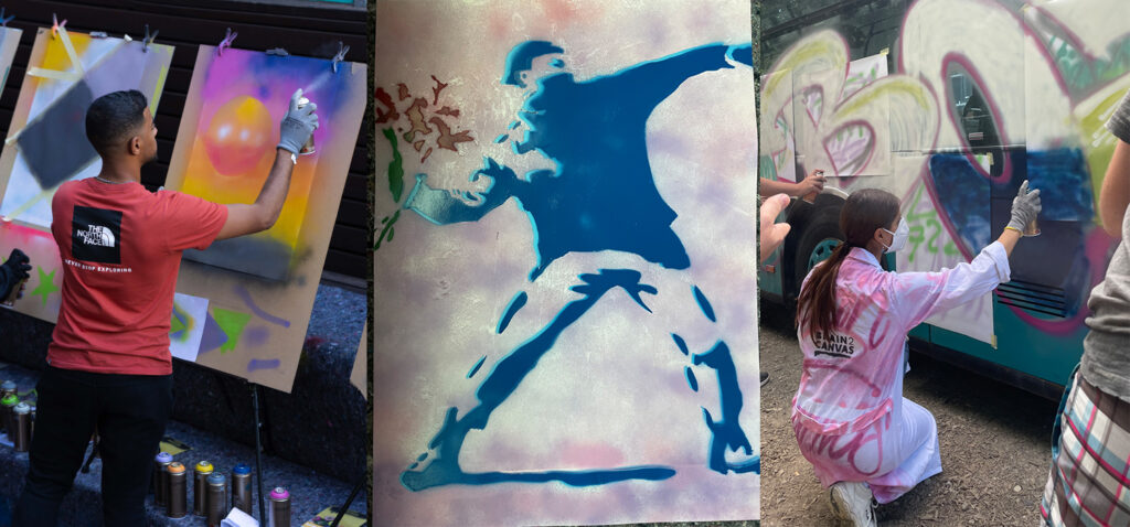 In unseren Kursen, in dem Graffiti Workshop gestaltet Ihr in zwei Stunden euer erstes Artwork, für 29€ habt Ihr dann euer eigenes neues Kunstwerk für zu Hause.